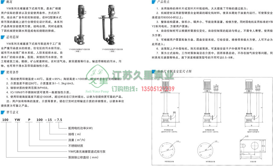 YW系列无堵塞液下式排污泵适用于工厂商 业严重污染废水的排放、住宅区的污水排污站、城市污水处理厂排水系统、人防系统排水站、自 来水厂的给水设备,医院、宾馆的污水排放、市 工程建筑工地、勘探、矿山配套附机、农村沼气池、家田灌溉等行业,输送带颗粒的污水、污 物,也可用于清水及带弱腐蚀性介质。