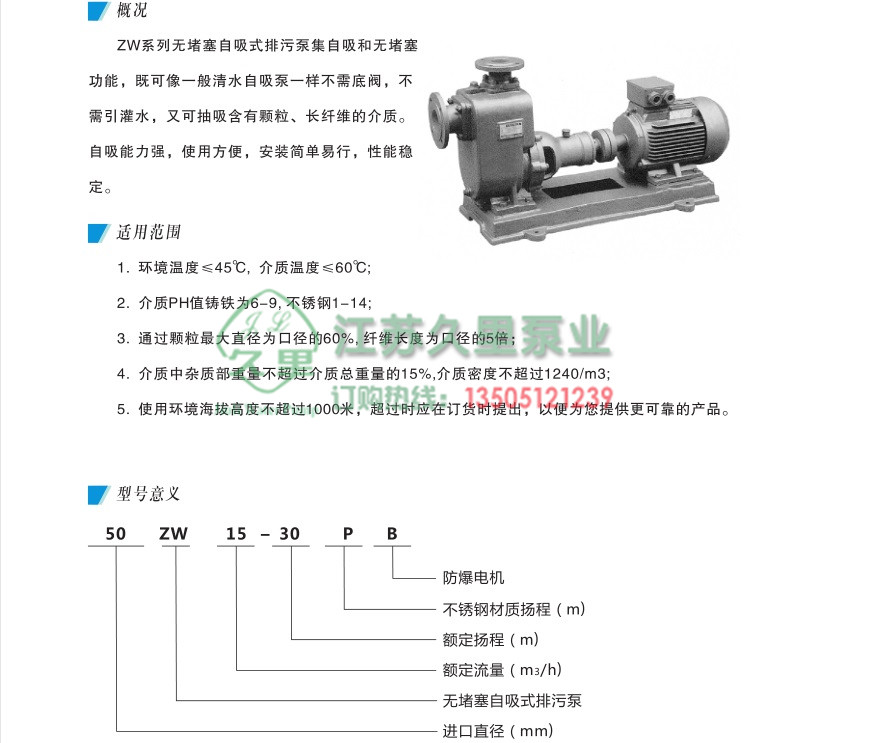 ZW系列无堵塞自吸式排污泵集自吸和无堵塞 功能,既可像一般清水自吸泵一样不需底阀,不需引灌水,又可抽吸含有颗粒、长纤维的介质。自吸能力强,使用方便,安装简单易行,性能稳定。